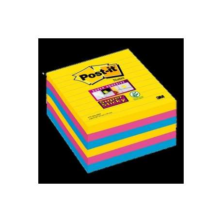 Foglietti Post-it® Super Sticky colori RIO formato 101X101 mm a righe. Confezione da 6 blocchetti da 90 foglietti cadauno.