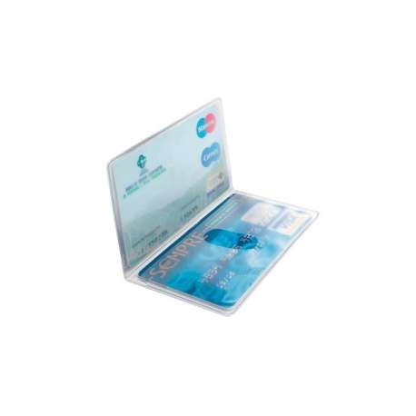 Salva Cards a 2 ante realizzati in PVC semi trasparente con 2 tasche con apertura dall’interno. Proteggono carte di credito, patente, bancomat, codice fiscale, schede telefoniche, ecc. Con asola interna per facilitare l’estrazione della carta. Confezione da 50 pezzi.