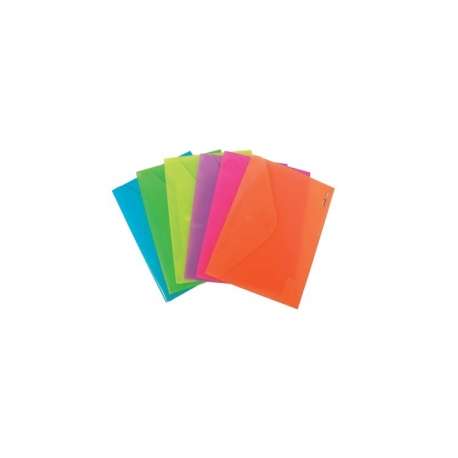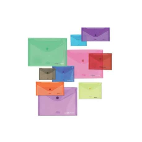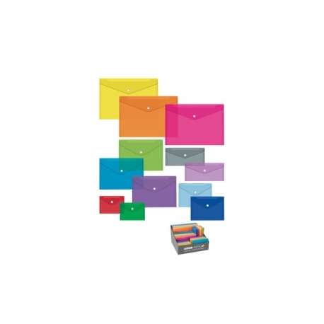 Buste in polipropilene con lavorazione esterna Twill diagonale e con bottone di chiusura in plastica bianca a pressione. Spessore PPL 0,18mm Confezione da 12 pezzi assortiti.