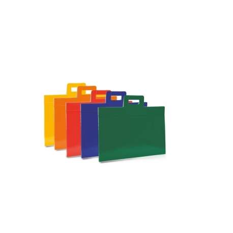 Cartella portadisegni con alette realizzata in cartoncino colorato plastificato lucido esterno. Maniglia fustellata, chiusura mediante elastico tondo in tinta