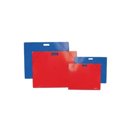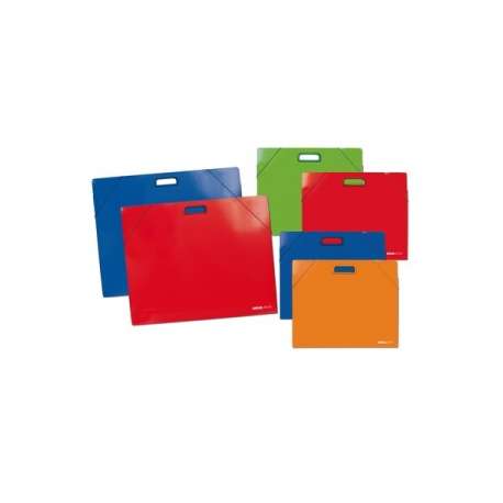 Cartella portadisegni in cartoncino verniciato lucido da 250 gr/mq, con maniglia in plastica ed elastico tondo di chiusura agli angoli. Munito di 2 alette laterali. Colori disponibili: rosso e blu.