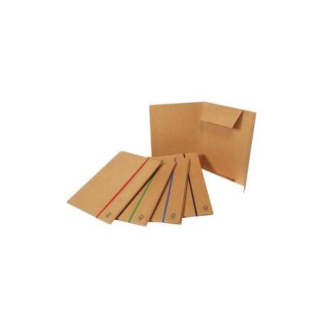 Cartellina 3 lembi realizzata in robusto cartone da 0,8 mm di spessore, ecologico certificato FSC, riciclato color avana. Piega e cordonatura centrale variabile, capacità contenitiva fino a 4 cm. Chiusura mediante elastico piatto da 5 mm colorato - assortito in 5 colori. Confezione termoretraibile da 5 pz