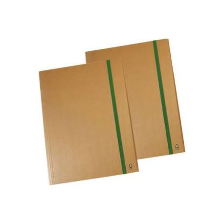 Capiente cartella a tre lembi con elastico piatto grande. realizzata in robusto cartone da 1,5 mm di spessore ecologico certificato FSC, riciclato color avana. Piega e cordonatura centrale a spessore variabile capacità contenitiva fino a 4 cm. 2 alette saldamente applicate su quadrante interno mediante 2+2 rivetti. Chiusura mediante elastico piatto da 15 mm di colore verde. Formato esterno 39x51 cm.