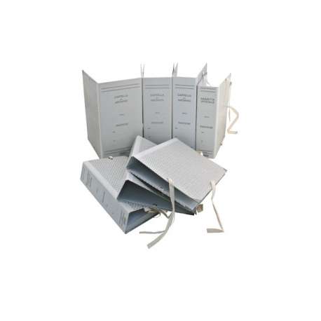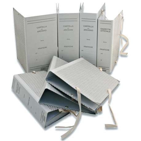 Faldone realizzato in robusto cartone accoppiato sp.1,8 mm, rivestito esternamente c/carta monolucida stampata 1 colore, risguarda interna in carta bianca. Chiusura mediante lacci in tela saldamente fissati alla struttura su tre lati mediante occhiello metallico. Lacci ripassati all' esterno per un immediato e corretto utilizzo. Disponibile con dorsi in diverse misure