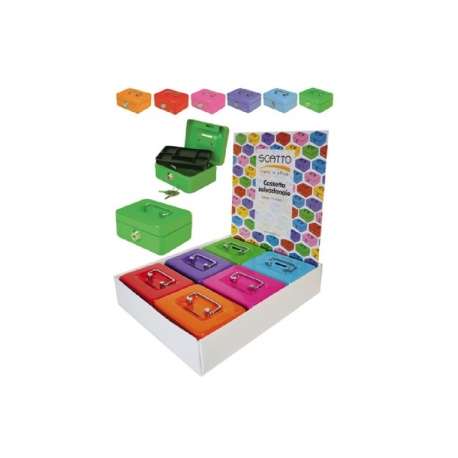 Cassetta portavalori in metallo con fessura. Dimensioni 12x6x9,5 cm. Colori assortiti.