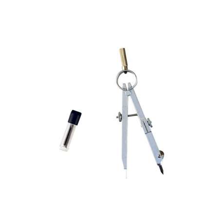 Compasso geometrico di precisione in metallo nichelato satinato antiriflesso, con asta centrale filettata e portamine. Confezionato in bustina plastificata.