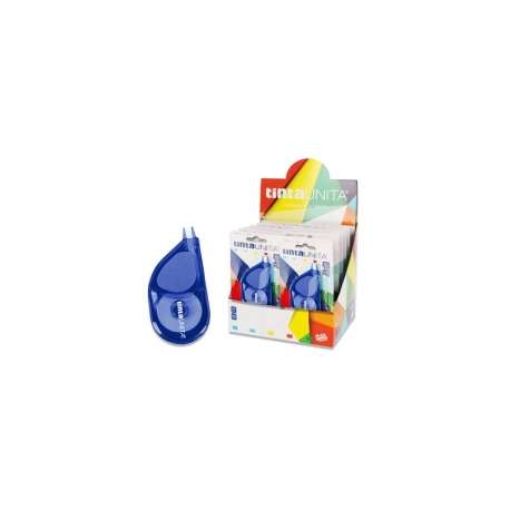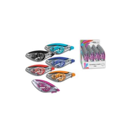 Correttore a nastro con guscio in plastica trasparente in 4 colori assortiti. Indicazione del consumo del nastro. Lunghezza 10 metri, altezza 5 mm.
