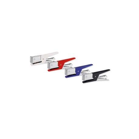 Robusta ed elegante. Massima profondità di cucitura. Interamente realizzata con parti tranciate in lamiera di acciaio. Mantiene un funzionamento perfetto per più di 50.000 cuciture. Caricamento posteriore. Molto utilizzata in ufficio, a casa, nei negozi, a scuola. Tipo di punto: passo 6 mm. Capacità di carica 140 punti. Disponibile nei 4 colori assortiti: nero, bianco, blu e rosso.