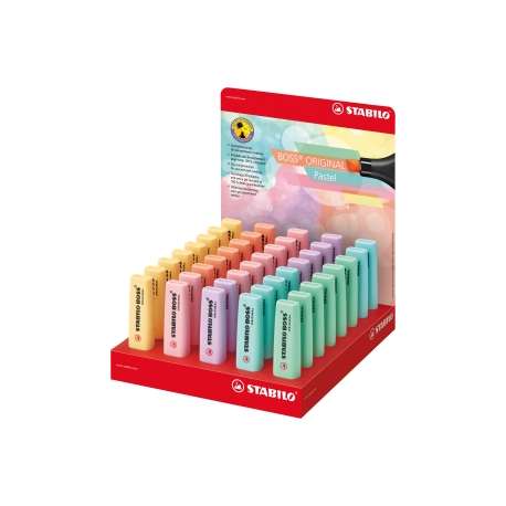 Evidenziatori STABILO BOSS ORIGINAL Pastel con punta a scalpello e inchiostro a base d’acqua. Pratici e dai colori tenui, questi evidenziatori sono pensati per durare a lungo anche senza cappuccio (fino a 4 ore). Tratto 2 / 5 mm. Disponibile ora anche nei colori pastello.