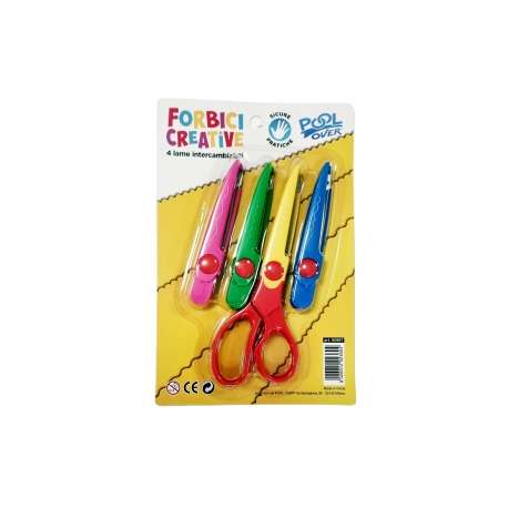 Forbici in plastica bicolore con 4 lame in acciaio intercambiabili e sagomate per realizzare diversi tagli creativi. Confezione in blister con 1 impugnatura e 4 lame.
