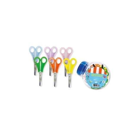 Forbici scolastiche con lame centimetrate in acciaio. Impugnatura colorata translucente in 6 colori: rosso, rosa, arancio, giallo, verde, blu. Barattolo da 48 pezzi assortiti.