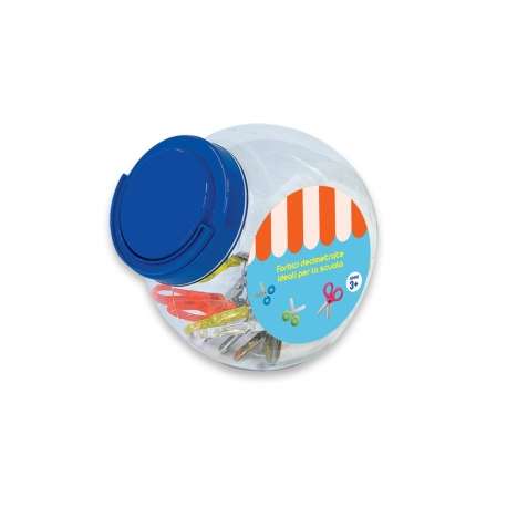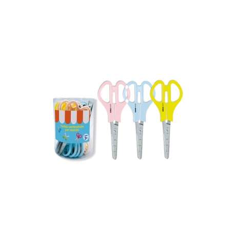 Forbici scolastiche con lame centimetrate in acciaio. Impugnatura per mancini colorata translucente in 3 colori: rosso, giallo, blu. Barattolo da 24 pezzi assortiti.