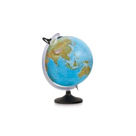 Globo geografico Uranio diam. 30 cm, luminoso, in rilievo tridimensionale: un’autentica sensazione visibile e tattile dei rilievi montuosi. Doppia cartografia: FISICA (spento) / POLITICA (acceso). Completo di lente d'ingrandimento, base in resina nera e semimeridiano in resina trasparente. Confezionato smontato in scatola chiusa.