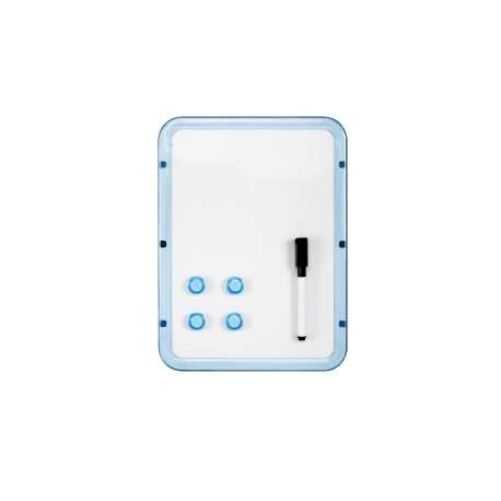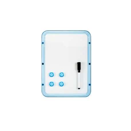 Lavagna magnetica munita di pennarello e magneti. Colore: celeste - giallo - rosa.