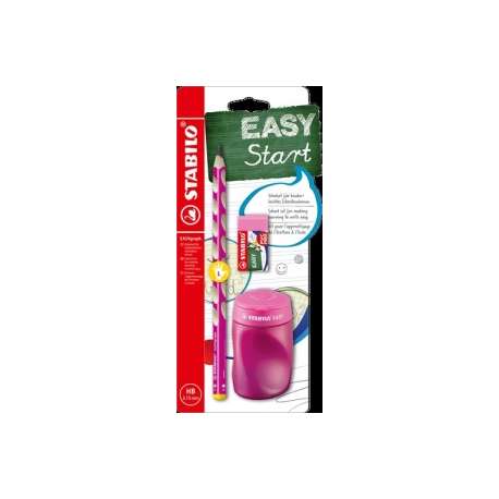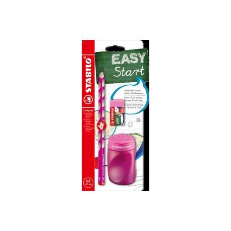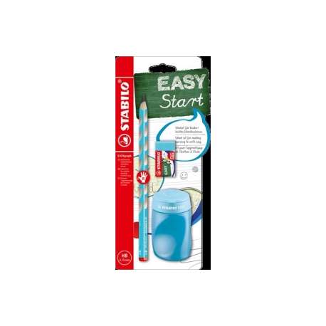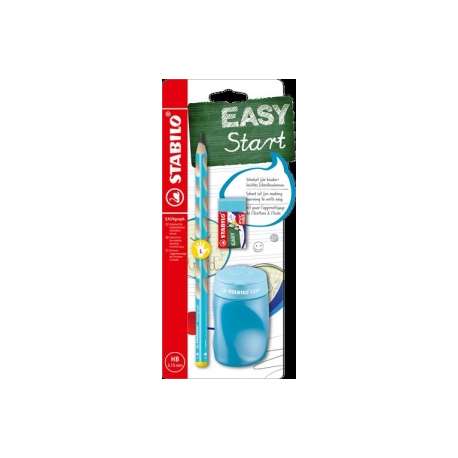 STABILO school set contenente una matita ergonomica STABILO EASYgraph in versione per mancini e destrimani, un temperino con serbatoio per mancini e destrimani ed una gomma senza PVC.