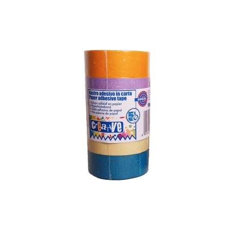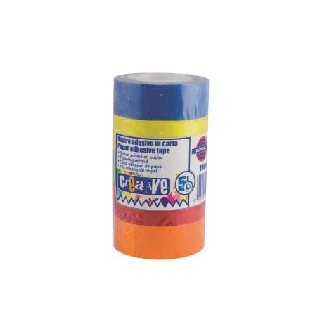 Nastro adesivo in carta colorata lacerabile a mano e scrivibile. Adatto per uso domestico, scuola e ufficio. Confezione da 5 rotoli in colori assortiti. Lunghezza da 10 metri.