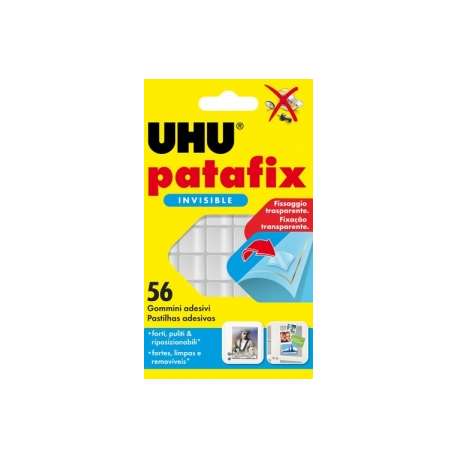 I nuovi gommini adesivi UHU Patafix Invisible, realizzati con il 100% di silicone acrilico trasparente, funzionano su tutti i tipi di superficie e sono completamente invisibili sul vetro e sotto gli oggetti trasparenti. Possono essere applicati direttamente senza doverli manipolare. I gommini UHU Patafix Invisible possono essere rimossi dalla maggior parte delle superfici lisce senza lasciare residui. Ideali per il fissaggio rapido di piccoli oggetti come foto, cartoline, disegni, poster e altro ancora su diverse superfici, tra cui porte, finestre o mobili. E’ ideale per studi grafici e di architettura, per fissare velocemente lucidi, poster, foto, cartoline, memo e decorazioni su specchi o finestre.