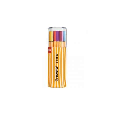 Fineliner point 88 con punta extrafine rinforzata in metallo, tratto da 0,4 mm. Dotati di cappuccio ventilato antisoffocamento. Durano a lungo anche senza cappuccio. Confezione di plastica da 20 colori.