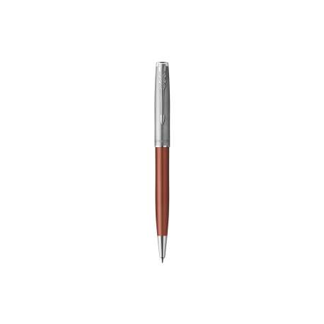 Penna con fusto in metallo metà in acciaio e meta' colore arancio. Clip tutta in acciaio.