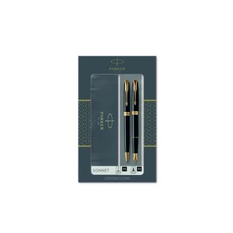 Parure contenente 1 Sfera + 1 Stilografica fusto nero opaco con clip in oro, in confezione regalo.