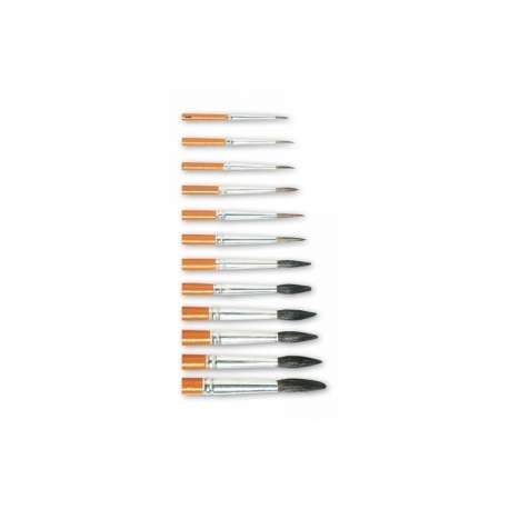 Pennello a punta tonda in pelo di cammello. Manico corto verniciato color ocra, ghiera in metallo antiruggine. Qualità scuola.