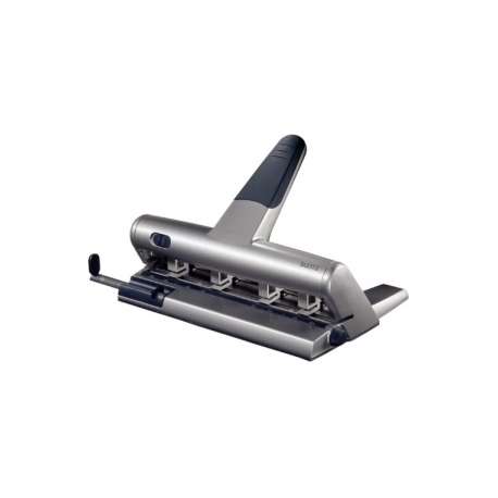 Perforatore professionale con base e maniglia in alluminio pressofuso, dotato di 4 punzoni indipendenti, aumentabili fino a 6. La scala graduata consente di posizionare i singoli punzoni nell'esatta posizione desiderata (guida di arresto con chiara lettura per A2, A3, Folio, A4, US, A5, A6, 8x8x8). Dotato di un fermo per bloccare la leva in posizione abbassata, riducendone l'ingombro quando non utilizzato.