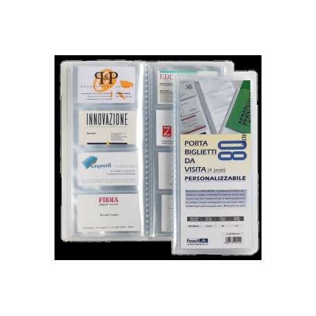 Portabiglietti da visita personalizzabile a fogli fissi realizzato in polipropilene. Con copertina flessibile trasparente e tasca per la personalizzazione. 20 fogli fissi saldati sul dorso a 4 tasche cadauno. Contiene 80 biglietti. Formato esterno 12,7x27 cm.