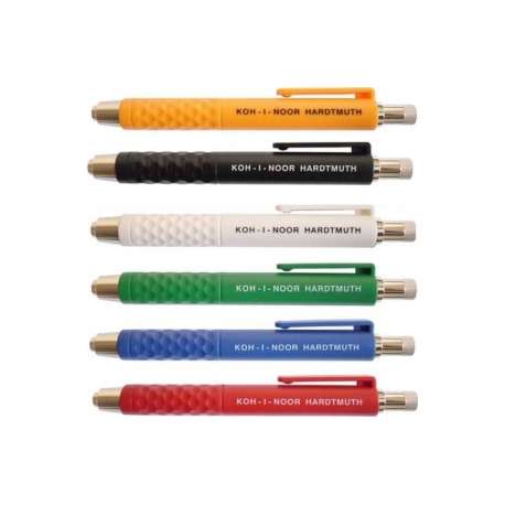 Portamine con fusto in materiale plastico colorato. Impugnatura con clip e affilamine incorporato nel pulsante. Mina da 5,6 mm.
