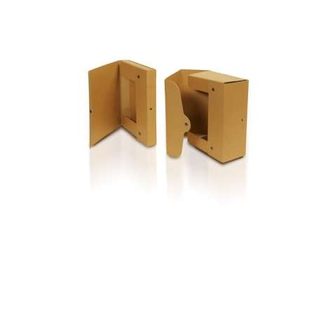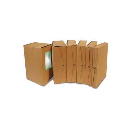 Scatola archivio realizzata in robusto cartone da 1,28 mm di spessore ecologico certificato FSC color avana. Chiusura mediante bottoni a pressione in acciaio brunito. scatola completamente apribile. Confezioni termoretraibili da 5 pz con all' interno 5 etichette adesive stampate. Disponibile con dorso in diverse misure. Formato chiuso 25 x H 35 cm