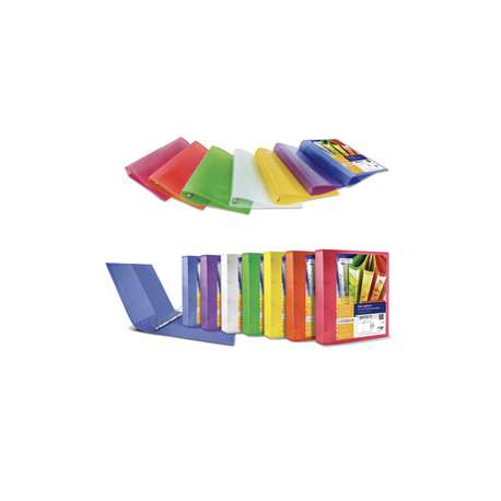 Raccoglitori personalizzabili con copertina in PP colorato, tasca interna e meccanismo a 4 anelli a D. Disponibile nei colori: neutro - blu - viola -giallo - verde - arancio - rosso. Formato 22x30 cm. Confezione da 10 pezzi.