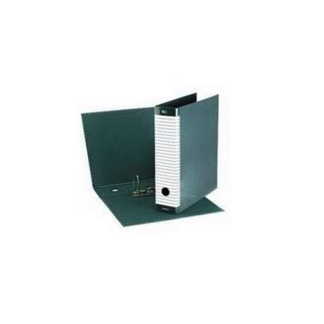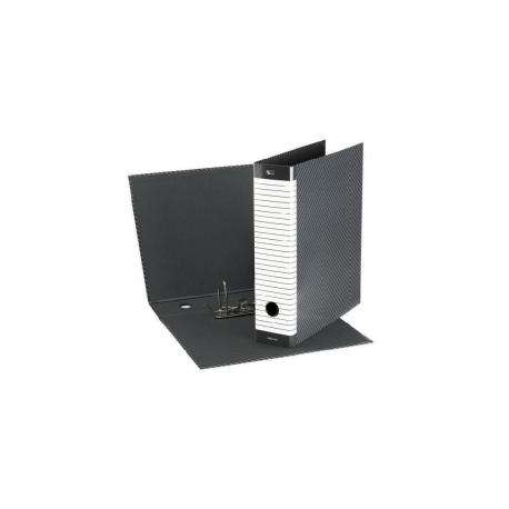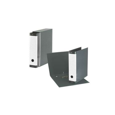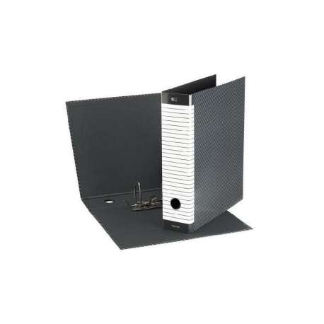 Registratore realizzato in cartone 2 mm 100% riciclato 100% riciclabile. Rivestito esternamente in carta stampata plastificata e internamente con carta stampata, custodia in fibrone verniciato 0.9 mm con rinforzi laterali metallici. Colore bianco/grigio.