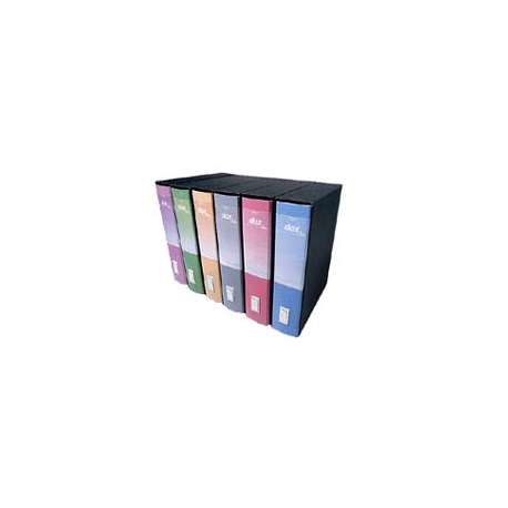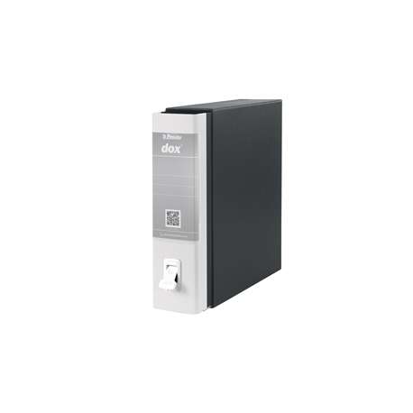 Registratore a leva Dox 1 formato commerciale. Struttura in cartone grigio rivestito con carta goffrata trattata anti-impronta. Formato esterno 29x32 cm. Formato utile 23x29,7 cm.