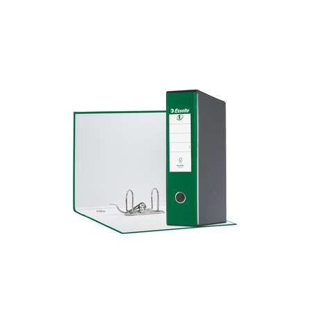 Cartone 100% riciclato 100% riciclabile 2 mm, rivestito in PPL 100 µ finitura tipo lino, portaetichetta sul dorso ed etichetta scrivibile su entrambi i lati, custodia in fibrone verniciato 0.9 mm con rinforzi laterali metallici. FSC Recycled.