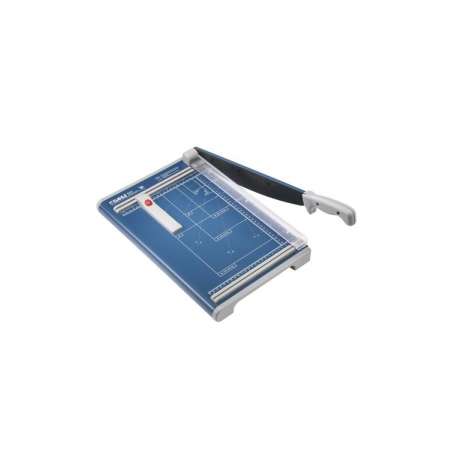 Taglierina a leva, lama superiore e lama inferiore di acciaio di alta qualita' . Pressino manuale proteggidita, squadra laterale, marginatore posteriore regolabile, piano marcato con formati DIN. Dimensioni 450x285 mm, peso 3,9 kg.