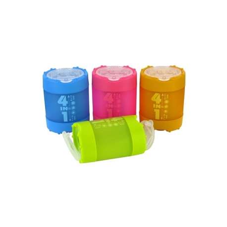 Temperino a serbatoio con due temperini in metallo a 2 fori incorporati. Confezione con colori assortiti.