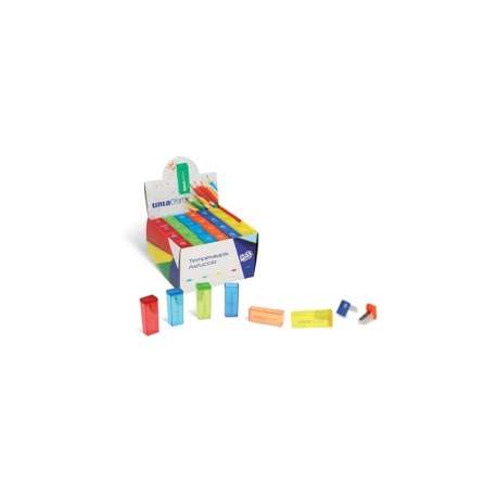 Temperamatite a 1 foro con serbatoio rettangolare. Confezione da 24 pezzi in colori assortiti.